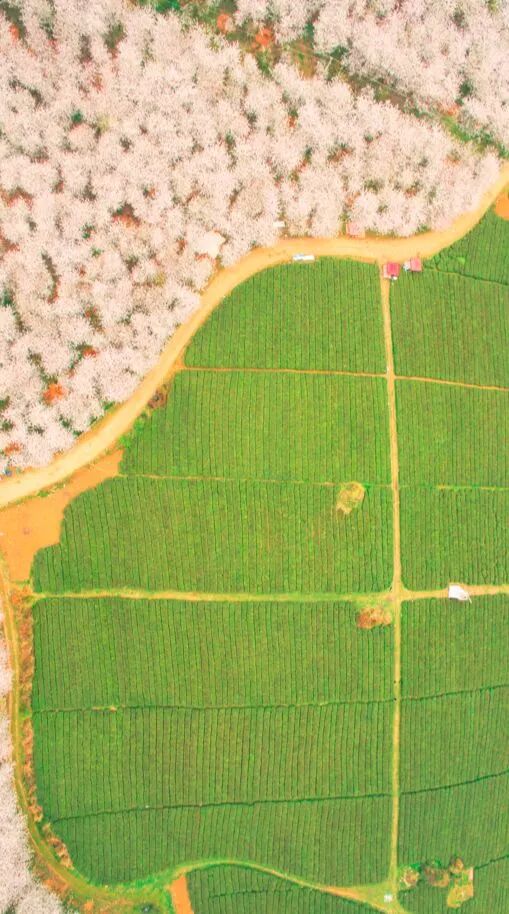 从高空俯瞰,大地仿佛披上了一件华美的袍子,湛蓝的底色,大面积的粉色立体绣花,还挂着串串绿宝石,勾着金色的花边,实在太美了!